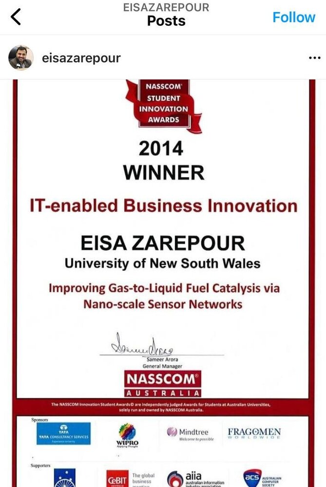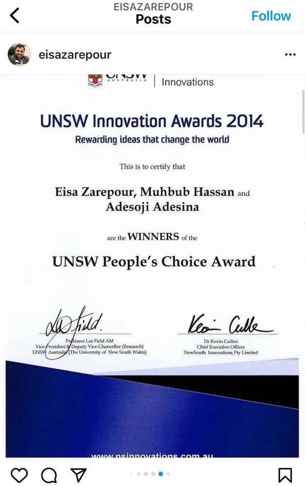 الحمدلله در آن سه سال ، علاوه بر ده جایزه علمی و پژوهشی که دریافت کردم، دانشگاه رساله دکتریام را هم به عنوان یکی از سه پایان نامه برتر دانشگاه برگزید. عکس بی کیفیتی هم که این شبکه پخش کرده، مربوط به انتخاب یکی از طرح های پژوهشیام به عنوان «طرح نوآورانه برتر سال دانشگاه» UNSW Innovator of the year بود که برای گرفتن جایزه به اتفاق خانواده به روی جایگاه رفتیم و اتفاقا این حضور خانوادگی با استقبال زیاد دانشجویان و اساتید مواجه شد.