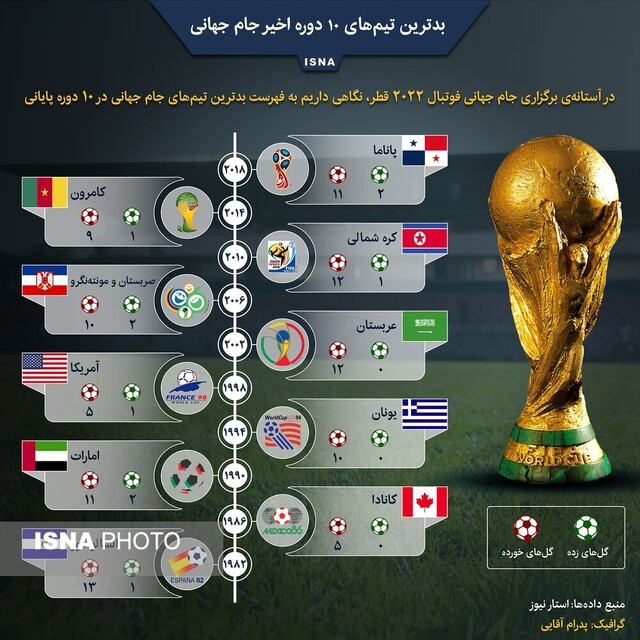 به نقل از استار نیوز، ۲۶ روز مانده به جام جهانی ۲۰۲۲ قطر، به فهرست بدترین تیمهای ادوار جام جهانی نگاه انداختهایم. این تیمها در هر دوره بدترین عملکرد را داشتند و از این نظر نامشان در تاریخ فوتبال جهان ماندگار شده است.