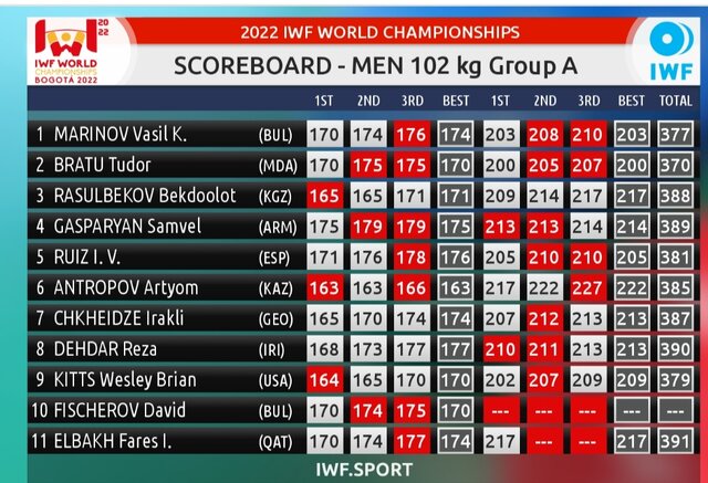 ۲- رضا دهدار از ایران با رکورد ۱۷۷ یک ضرب، ۲۱۳ دوضرب و مجموع ۳۹۰ کیلوگرم ( طلای یک ضرب و نقره مجموع)