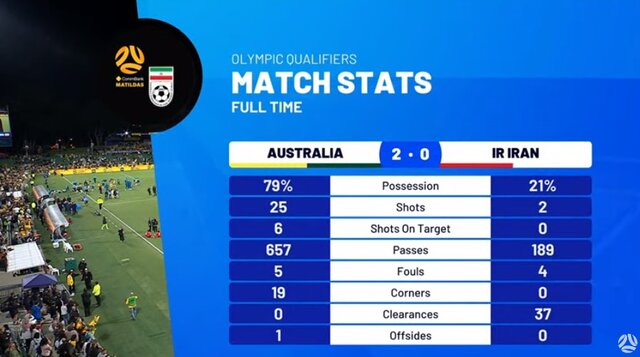 در نهایت این دیدار با نتیجه ۲-۰ به سود استرالیای میزبان به پایان رسید. در این دیدار استرالیا ۷۹ درصد مالکیت توپ را داشت و ایران ۲۱ درصد صاحب توپ بود. همچنین آمار ۶۵۷ پاس استرالیا در مقابل ۱۸۹ پاس ایران به ثبت رسید.