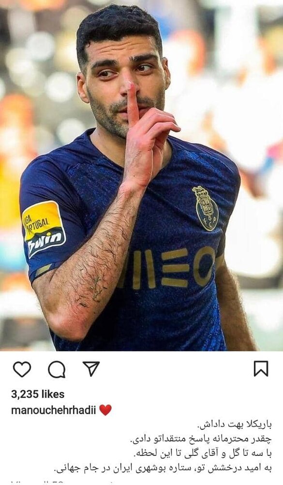 منوچهر هادی کارگردان سینما و تلویزیون در واکنش به این موضوع پستی در اینستاگرامش منتشر کرد و نوشت: «باریکلا بهت داداش. چه‌قدر محترمانه پاسخ منتقدانت را دادی. با سه تا گل و آقای گلی تا این لحظه. به امید درخشش تو ستاره بوشهری ایران در جام‌جهانی. »